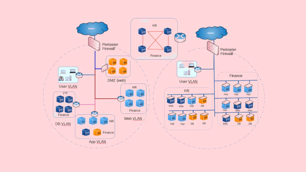 • Network Virtualization: VMware NSX allows businesses to create virtual networks and apply microsegmentation policies at the virtual network layer, offering fine-grained control over network traffic.